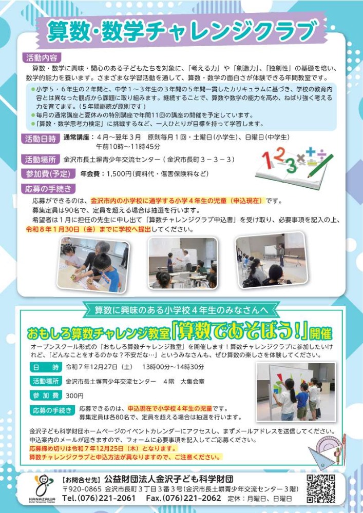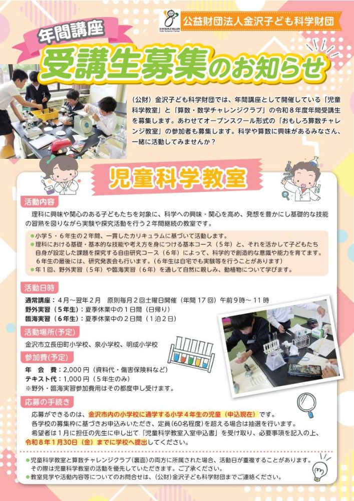 金沢子ども科学財団では、年間講座として開催している「児童科学教室」「算数チャレンジクラブ」の次年度受講生を各学校を通じて募集しています。科学や算数に興味のあるみなさん、仲間と一緒に活動してみませんか?多くの方のご応募をお待ちしています。